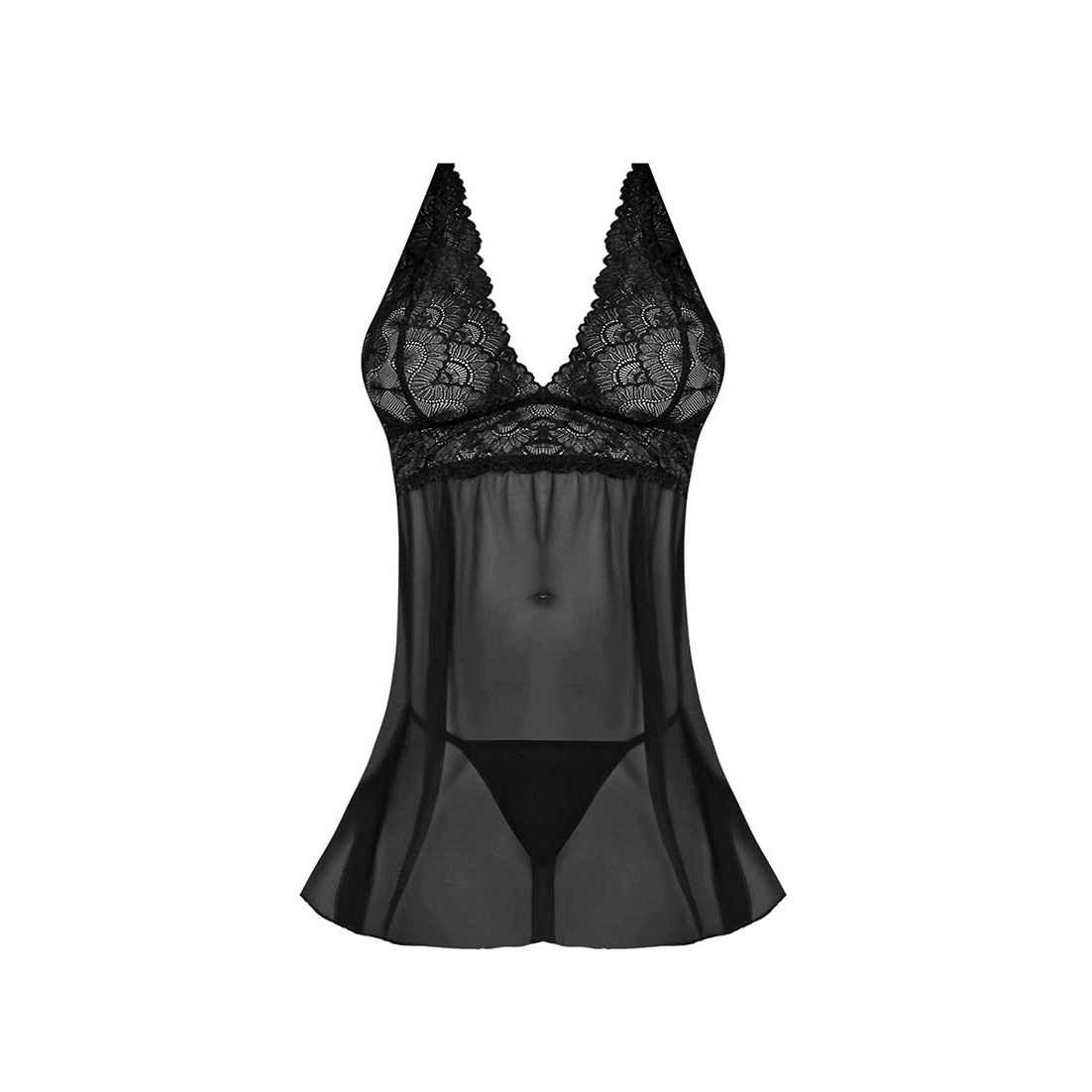 Babydoll crne boje s prekrasnim uzorkom na grudima. Sexy detalj su otvorena leđa u obliku V-izreza i duboki izazovni dekolte. Naramenice su podesive, a materijal i kroj se izvrsno prilagođavaju građi tijela. U pakiranju osim babydolla dolaze i mini crne klasične tange.