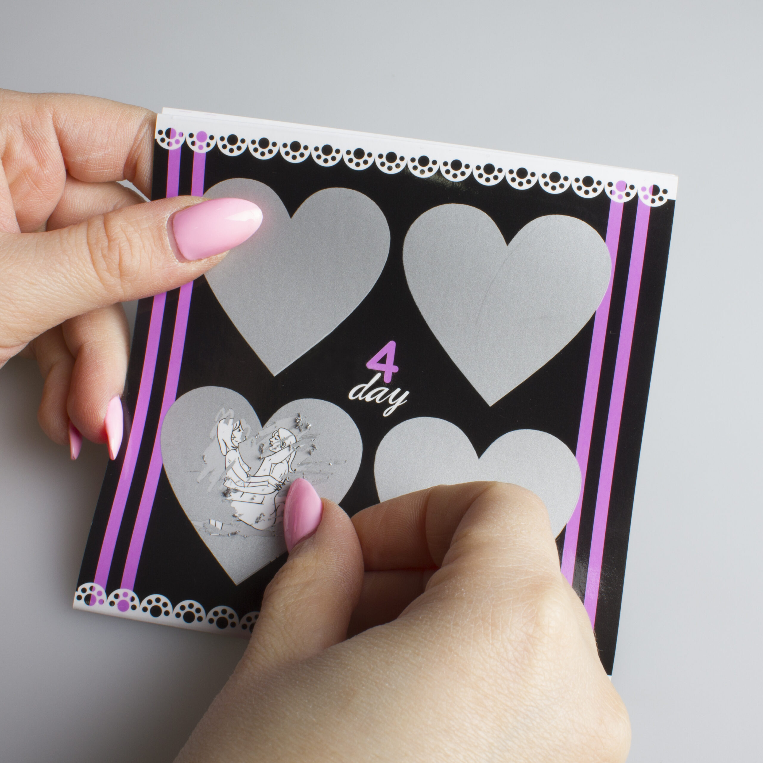 • Svakom danu u tjednu pripadaju četiri srca koja skrivaju različite seksualne poze. Svaki dan izaberite jedno od četiri srca s kojeg ćete struganjem skinuti emulziju i prepustiti se seks pozi koju ste otkrili. Trajanje igre je 7 dana.