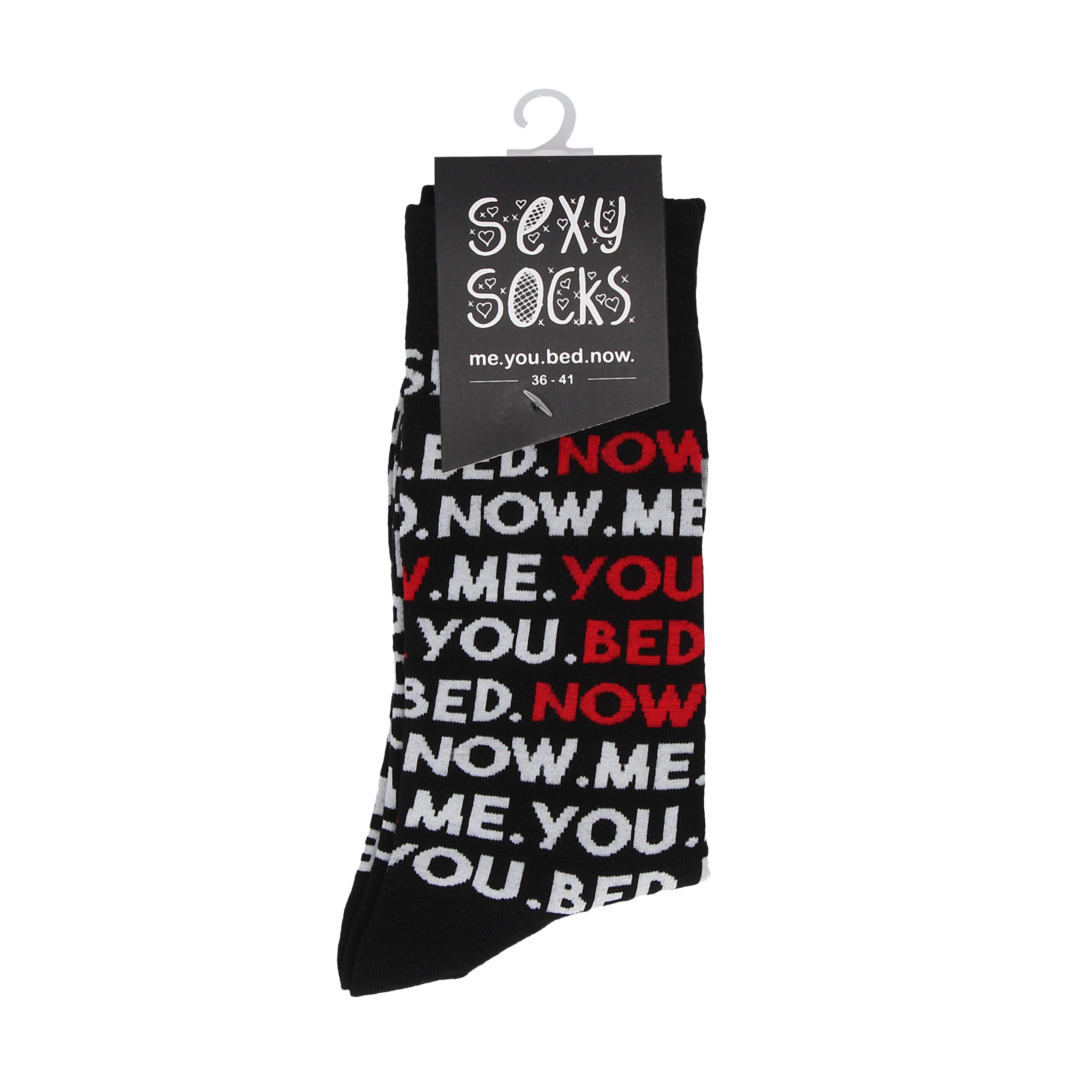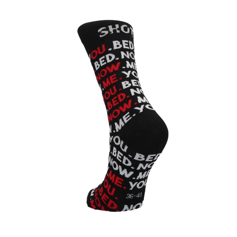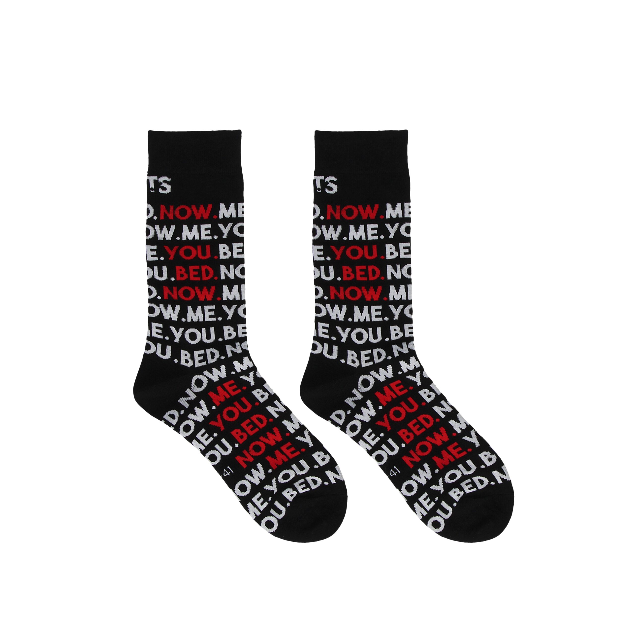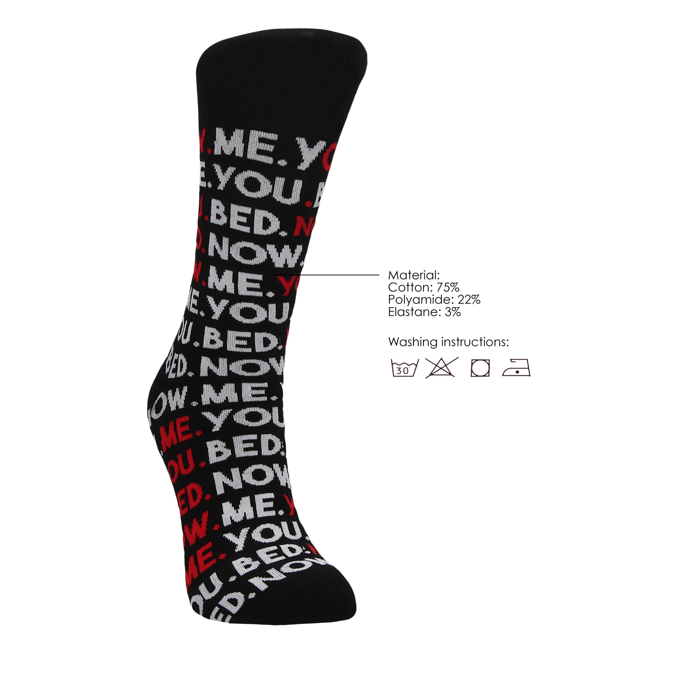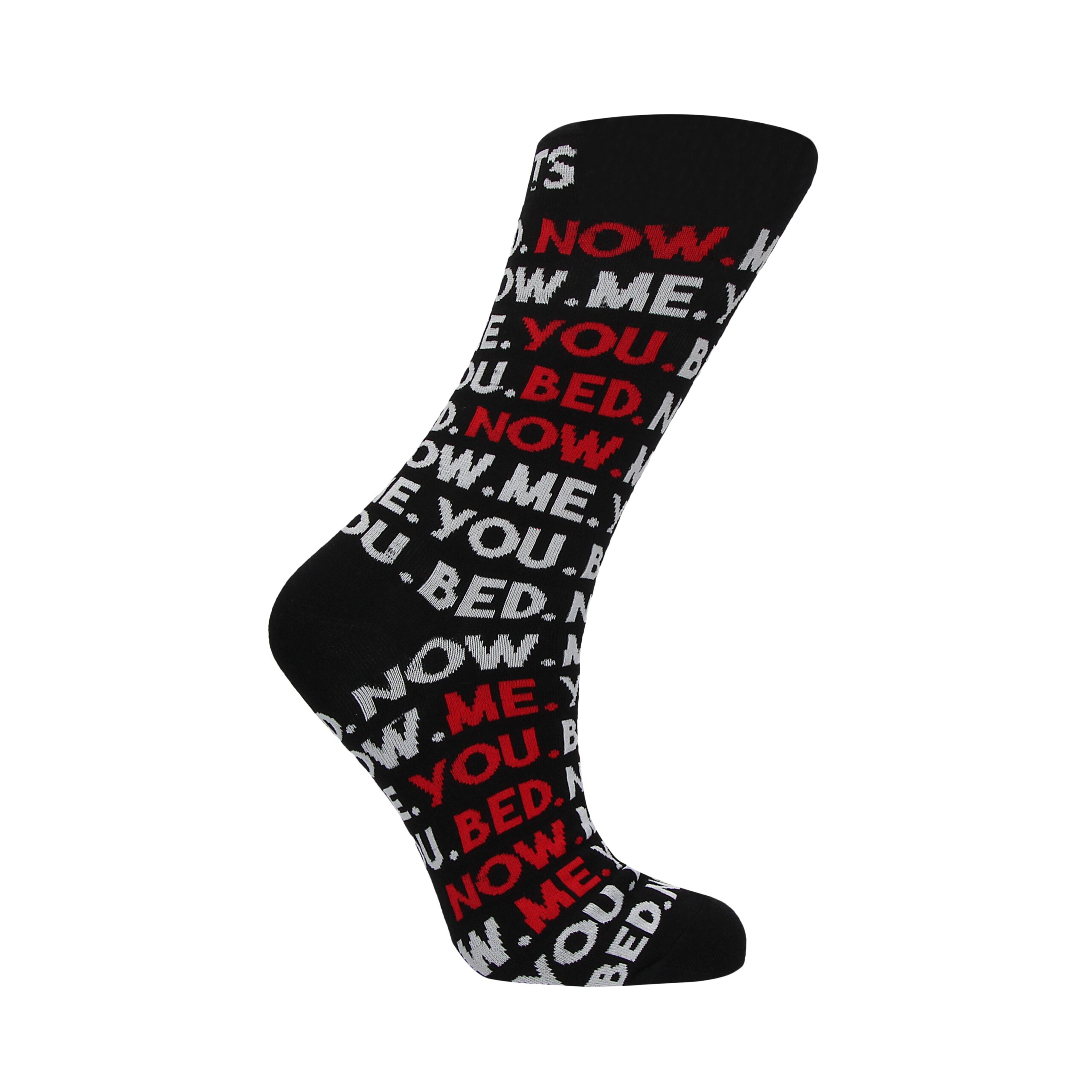 Šaljive crne čarape sa natpisom “You Me Bed Now”