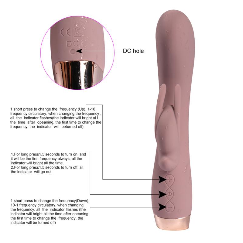 Prije i poslije upotrebe isperite vibrator vodom i blagim sapunom ili isperite vodom i dezinficirajte sredstvom za čišćenje igračaka za odrasle. Kako biste pokrenuli uređaj, držite tipku za paljenje 2-3 sekunde. Punjenje uređaja- Potpuno punjenje traje 100 min. Dok se uređaj puni, svijetlo za indikaciju će treperiti, nakon što je uređaj potpuno napunjen, svijetlo za indikaciju gori neprekidno. Na donjoj strani uređaja nalazi se utor za punjenje prekriven silikonom (mala udubina s oznakom DC). Lagano umetnite punjač preko sloja silikona, te zatim drugi kraj punjača umetnite u USB utor (računalo, adapter za punjenje). Punjač je potrebno umetnuti do kraja u utor za punjenje na vibratoru kako bi se punjenje odvijalo ispravno.